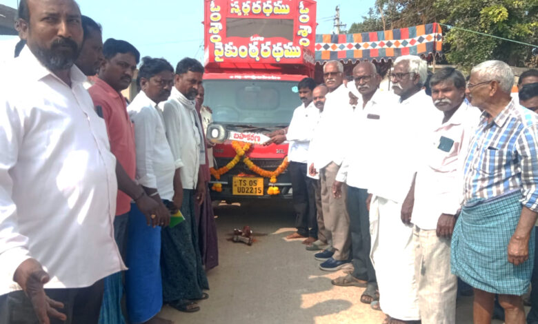 నల్గొండ జిల్లా వేములపల్లి మండలంలోని రావులపెంట గ్రామానికి చెందిన కర్నాటి సోమయ్య–అరుణ దంపతులు గ్రామ పంచాయతీకి వైకుంఠ రథాన్ని బహుకరణ చేశారు. ఈ సందర్భంగా కర్నాటి సోమయ్య మాట్లాడుతూ..పెద్దలు చెప్పినట్లుగా బతికినన్నాళ్లు ఎలా బతికినా, మరణించిన తర్వాత గౌరవప్రదమైన అంతిమయాత్ర ఉండాలనే ఉద్దేశంతో ఈ రథాన్ని గ్రామానికి బహుకరిస్తున్నట్లు తెలిపారు.