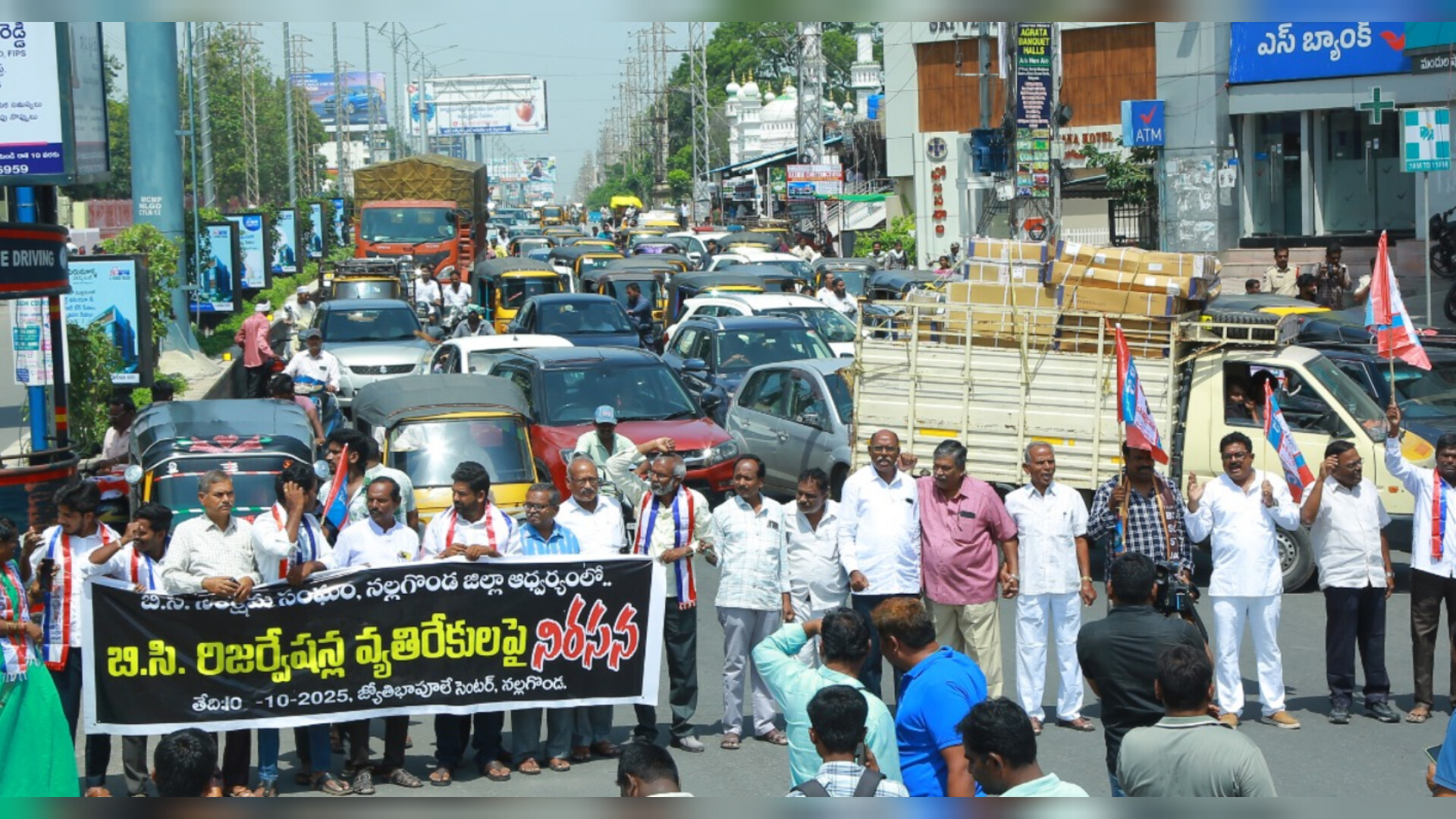 42 శాతం రిజర్వేషన్ల హైకోర్టు నాలుగు వారాలు స్టే విధించడానికి తీవ్రంగా వ్యతిరేకిస్తూ ఉమ్మడి బీసీ సంఘాల ఆధ్వర్యంలో నల్లగొండ క్లాక్ టవర్ వద్ద రాస్తారోకో శుక్రవారం నిర్వహించారు. బీసీ సంక్షేమ సంఘం నల్లగొండ జిల్లా అధ్యక్షుడు దుడుకు లక్ష్మీనారాయణ మరో బీసీ సంక్షేమ సంఘం జిల్లా ప్రధాన కార్యదర్శి నేలపట్ల సత్యనారాయణ పాల్గొని పెద్ద ఎత్తున నిరసన కార్యక్రమాలు బీసీల తో కలిసి నిర్వహించడం జరిగింది.