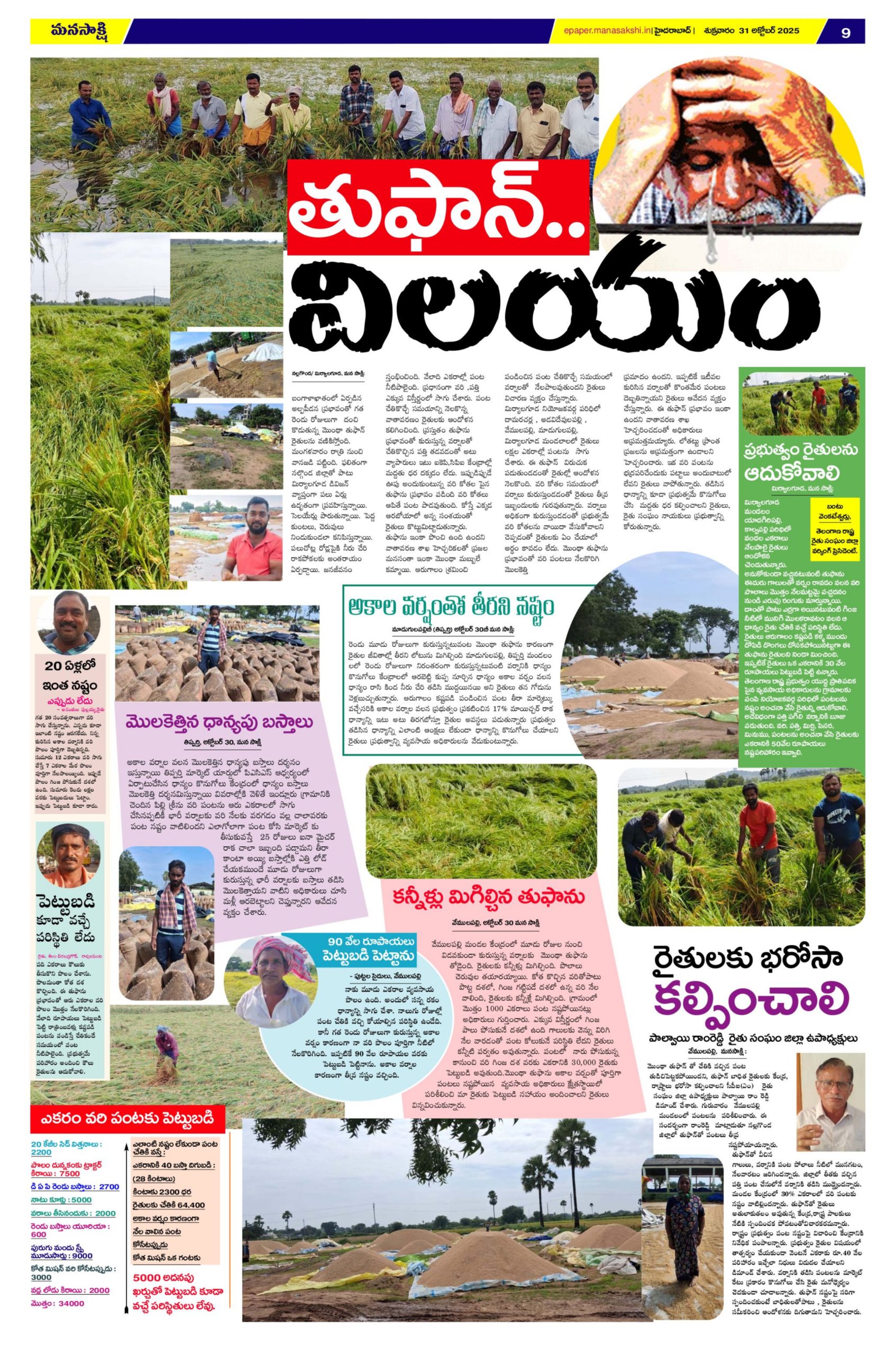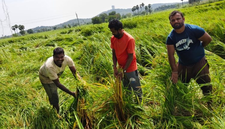 ఎక్కువ విస్తీర్ణంలో గింజ పాలు పోసుకునే దశలో ఉంది గాలులకు వెన్ను విరిగి నేల వారడంతో పంట కోలుకునే పరిస్థితి లేదని రైతులు కన్నీటి పర్వతం అవుతున్నారు. పంటలో నారు పోసుకున్న కానుంచి వరి గింజ దశ వరకు ఎకరానికి 30,000 రైతుకు పెట్టుబడి అవుతుంది.మొంథా తుఫాను అకాల వర్షంతో పూర్తిగా పంటలు నష్టపోయిన వ్యవసాయ అధికారులు క్షేత్రస్థాయిలో పరిశీలించి మా రైతుకు పెట్టుబడి సహాయం అందించాలని రైతులు విన్నవించుకున్నారు.