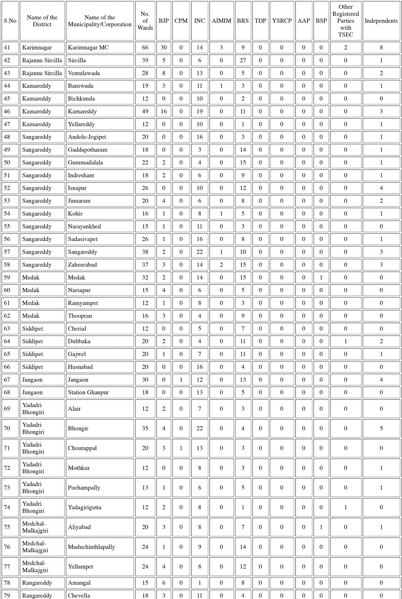 తెలంగాణ మున్సిపల్ ఎన్నికల్లో తుది ఫలితాలను అధికారికంగా ప్రకటించారు. అధికారిక ప్రకటన ప్రకారం రాష్ట్ర వ్యాప్తంగా 116 మున్సిపాలిటీలు, ఏడు మున్సిపల్ కార్పొరేషన్లలో ఎవరికి ఎన్ని వార్డులు కైవసం చేసుకున్నారని అధికారికంగా వెల్లడించారు. అధికారిక లెక్కల ప్రకారం..