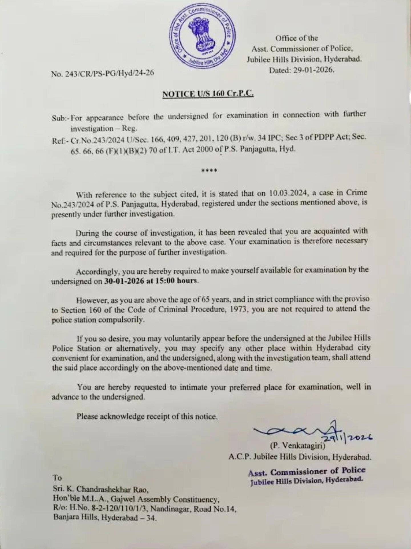 శుక్రవారం విచారణ చేయనున్నామని ఆయన విచారణకు రావలసిన అవసరం లేదని, ఎక్కడికి రావాలో చెప్తే తామే వస్తామని పేర్కొన్నారు. ఫోన్ ట్యాపింగ్ కేసులో విచారణకు హాజరు కావాలంటూ కేసిఆర్ కు వ్యక్తిగతంగా నోటీసులు అందజేసింది.