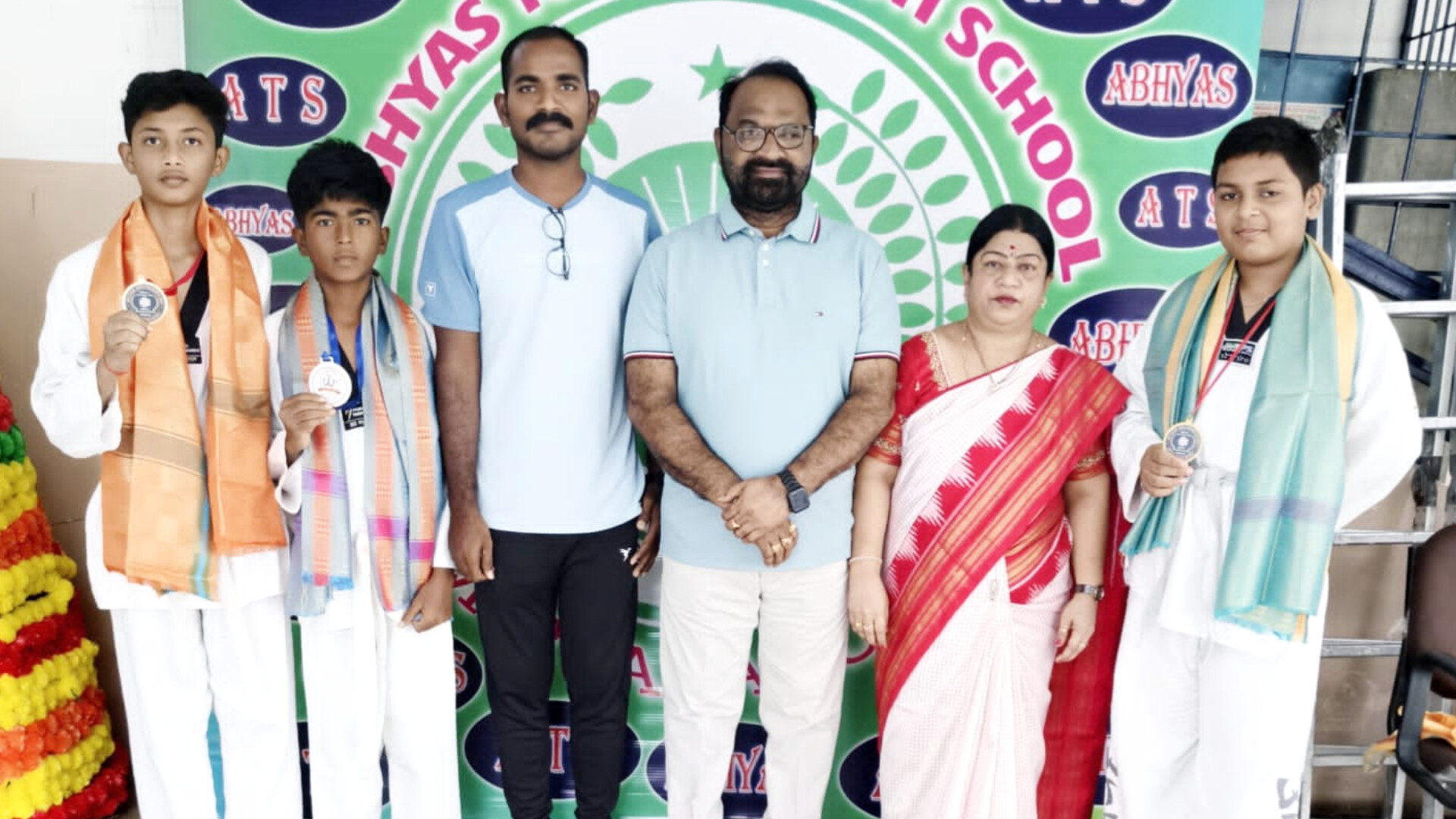 కాగా అభ్యాస్ టెక్నో హై స్కూల్ చైర్మన్ వంగాల నిరంజన్ రెడ్డి, డైరెక్టర్ వంగాల పుష్పలత తమ విద్యార్థులను, కోచ్ ను శాల్వాలతో సత్కరించి జాతీయ, అంతర్జాతీయ స్థాయిలో రాణించాలని అభినందిచారు.