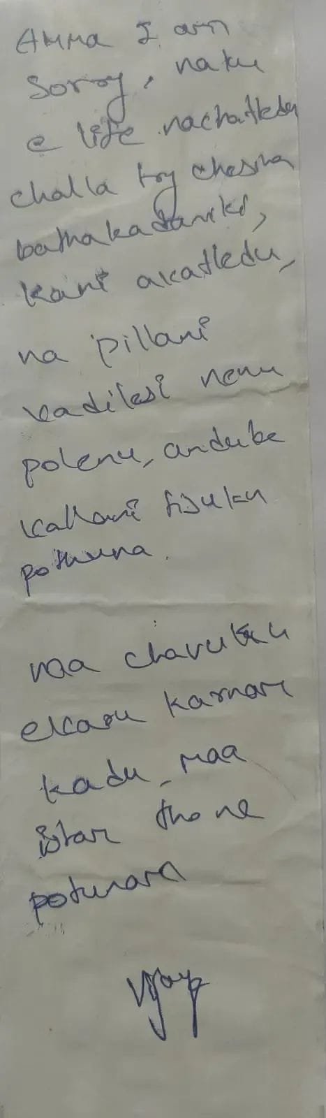 సూసైడ్ కు ముందు కారు పార్కింగ్ స్లిప్ పైన రాసినట్లుగా తెలుస్తుంది. సూసైడ్ నోట్లో ఐ యాం సారీ అమ్మ నాకు ఈ లైఫ్ నచ్చడం లేదు. చాలా ట్రై చేశా బతకడానికి కానీ అవ్వట్లేదు. నా పిల్లలని వదిలేసి నేను పోలేను. అందుకే వాళ్ళని తీసుకొని పోతున్న. మా చావుకు ఎవరు కారణం కాదు. మా ఇష్టంతోనే పోతున్నాం. అని రాసిన లేక చూసి ప్రతి ఒక్కరు కంటనీరు పెడుతున్నారు.